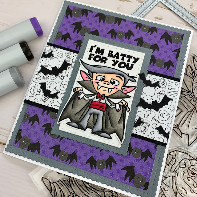 This set comes with 3 cute little monsters. My favorite is the vampire below. I used the C.C Designs Scalloped Rectangle Metal Die and Stitched Rectangle Metal Die to frame this handsome vampire.