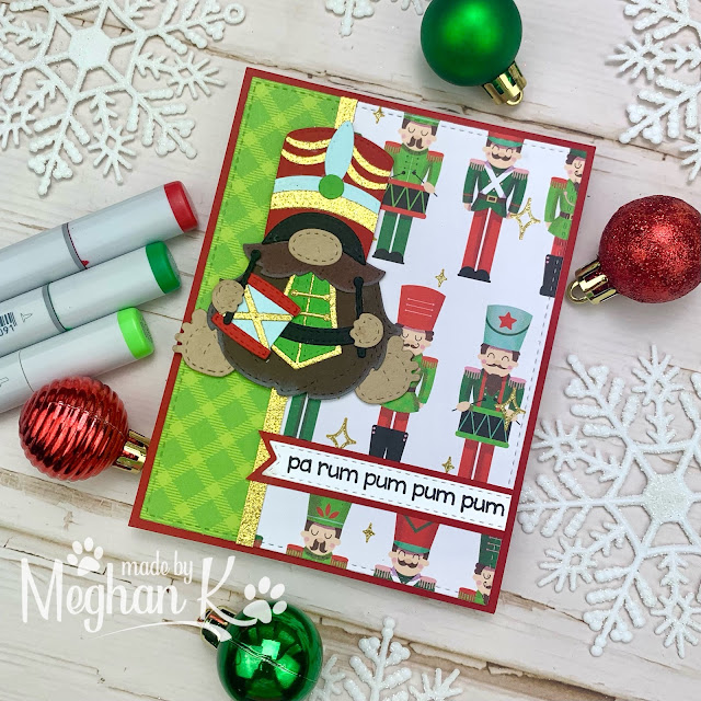 I was inspired by the Jaded Blossom June Challenge Masculine for these two nutcracker boy gnome cards. I used the Build Your Holiday Stash Sketch Challenge #46 (flipped vertical) for my design. I love that I found matching nutcracker paper for the background.